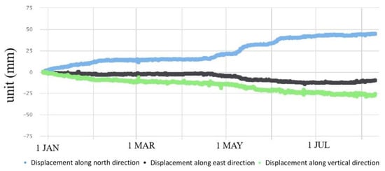 GPS 07 showed significant changes in position during the monitoring period and the displacement to the north reached 71 mm in April 2017, when the equipment was removed. The recorded 3D displacements of GPS 08, 10, 11 and 12 were less than 10 mm, which also indicated that the entire slope was relatively not seriously unstable. Based on the real-time monitoring data, necessary engineering disposal measures, such as slope unloading, subgrade raising, retaining walls, a square bolt frame and an anchor cable lattice, were undertaken during the construction period. Thus, the deformation of the slopes was mitigated during 2017.