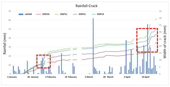 The widths of crack meters DISP 01–05 and 08 reached 5.18 mm, 8.88 mm, 0.83 mm, 3.8 mm, 1.38 mm and 2.41 mm, respectively, from 3:00 to 12:00 am of 29 May. At 3:00 am the rainfall reached 30.5 mm/h (56 mm over the whole day). The widths of crack meters DISP 01–05 and 08 reached 2.48 mm, 3.75 mm, 0.46 mm, 1.16 mm, 0.94 mm and 1.76 mm, respectively, from 3:00 to 12:00 am of 29 May. At 8:00 am the rainfall reached 41 mm/h (67 mm over the whole day).