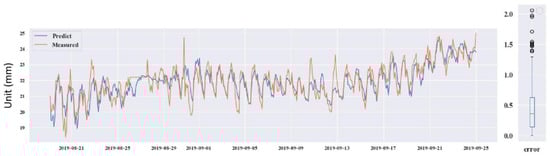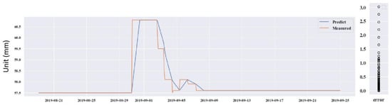 The four testing GPS devices were numbered as GPS 04, 06, 12 and 14. GPS 04, 06 and 12 were retained after the construction period. GPS 14 was installed on 21 June 2016, after the protection construction work finished, in the #12 slope. Looking through the data from the operation of the monitoring system to now, it can be seen that the deformations on the four GPS stations were induced by the rainfall. Thus, precipitation was chosen as the input influence index, which was also analyzed by Wu et al. (2018) []. The prediction used the DeepAR model. The predicted results for the four GPS devices are shown in Figure 13, Figure 14, Figure 15 and Figure 16.