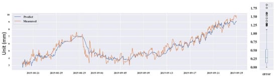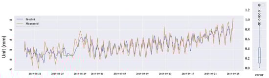 Through predicting the deformation of GPS 04, 06, 12 and 14, the predictive ability of the DeepAR model in the instability slopes has been demonstrated. The MAE and RMSE values are small and the R2 values are close to 1. However, some measured and predicted data cannot be matched (see in Figure 13, Figure 14, Figure 15 and Figure 16). The local abnormal prediction might be caused by a dependent variable, external disturbance of the construction work or temperature excursion of a pressure sensor.