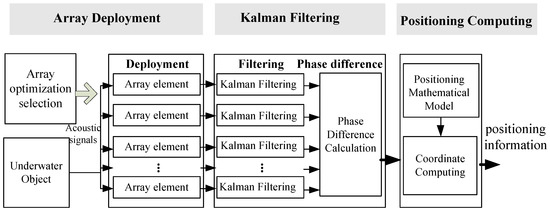 We show the framework of the underwater positioning system as Figure 1. It is composed of three main components: “Array Deployment”, “Kalman Filtering”, and “Positioning Computing”.
