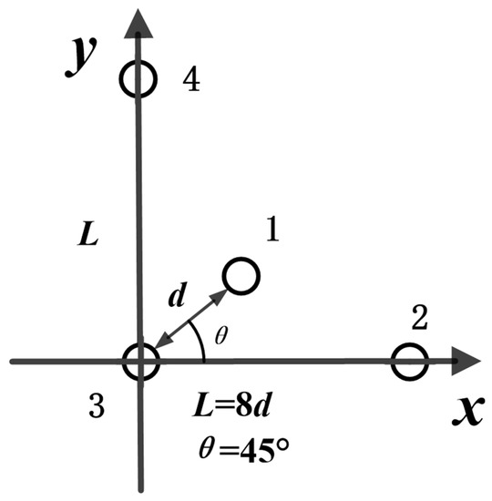 In our study, we deployed the non-equidistance, quaternary array of the proposed USBL positioning system. It is demonstrated in Figure 3. The array element spacing is , and the parameter settings are the same as the traditional USBL orthogonal array. The angle between the x-axis and Element 1 is equal to 45°. The distance between Element 3 and Element 2 is 8-fold that of ; the same to distance exist between Element 3 and Element 4. To solve the ambiguity phenomenon of the phase difference between Array Element 2 and Array Element 3, and between Array Element 3 and Array Element 4, we utilized the projection of the signal received by Element 1 and Element 3 on the x-axes and the y-axes, respectively. The advantage of the new array is that it could reuse the signals received by Array Element 3 three times, reducing the design of additional, redundant array elements.