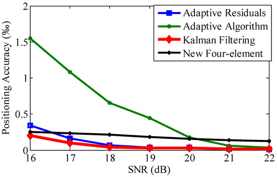 Figure 9 and Table 4 illustrate that the proposed positioning method improves the accuracy effectively compared with the other positioning methods. More specifically, relative to the adaptive filtering method, the proposed method can improve the accuracy by 82.49%. The proposed method can improve the accuracy by 16.14% compared with the adaptive residuals-based method, especially when the SNR is below 20 dB. Relative to the new four-element positioning method, the proposed positioning method can improve the accuracy by 70.97%. That is because, with the quaternary element array and Kalman filtering strategy, we can improve the positioning accuracy further.