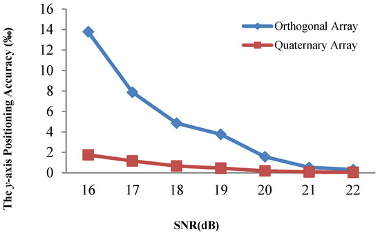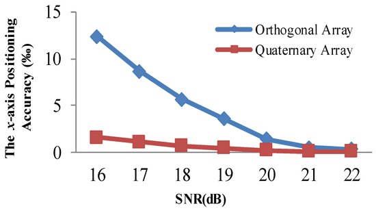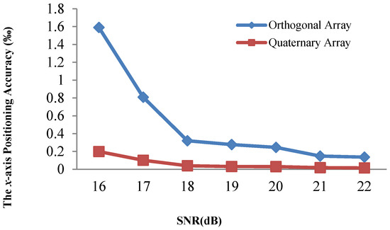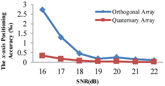 Figure 10, Figure 11 and Figure 12 illustrate that the x-axis positioning accuracy with the quaternary array is higher than that with the traditional array. More specifically, their accuracy with the quaternary array is higher than that with the traditional array, 7.98-fold, 6.54-fold, and 7.99-fold under these three positioning methods.