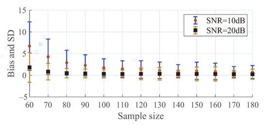 The performance of our method is also compared with the bandwidth estimation method in Reference [], in which a dictionary of 80 bandlimited kernels is constructed with and the regularization parameter in it is set to 0.01 by cross validation. We first simulate the performance of bandwidth detection at different noise levels for bandwidth , the sample size is set to . The results are shown in Figure 3. We can find that the bias and standard deviation (SD) of Algorithm 1 and sparsity based method [] are similar for small bandwidth at low noise level. For large bandwidth, the bias and SD of our method are significantly smaller than those of Reference []. This is because the GS is no longer sparse for large bandwidth, which is out of the scope of sparsity based method []. At high noise level, Algorithm 1 is much more robust than Reference [] especially when the bandwidth is close to the sample size.