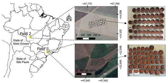 The location of the two studied agricultural fields in Brazil, and the soil samples collected from them.