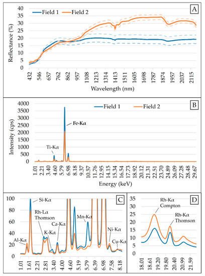 Mean spectra of Field 1 and Field 2: Obtained with visible and near infrared (vis-NIR) sensor (A), and X-ray fluorescence (XRF) sensor (B). Snapshot of the emission lines from 1.01 to 8.18 keV (C) and scattering peaks between 18 and 21 keV (D) are shown. Vis-NIR spectra are presented together with their standard deviation above and below the curve. Counts of photons per second obtained for XRF have been abbreviated as cps.