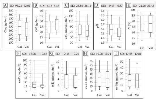 Box plot for the calibration (Cal) and validation (Val) dataset, showing the standard deviation (SD) and range of variation for the contents of clay (A), organic matter (OM) (B), cation exchange capacity (CEC) (C), pH (D), base saturation (V) (E), and extractable (ex-) P (F), K (G), Ca (H), and Mg (I). The skewness and kurtosis values of the datasets are presented in the Table A1, in the Appendix Section.