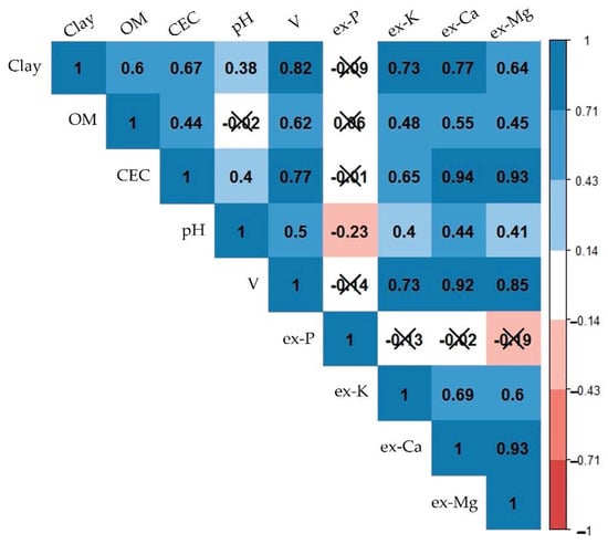 Matrix of Pearson’s correlation of the studied soil fertility attributes. Organic matter, cation exchange capacity, base saturation, and extractable nutrients were abbreviated as OM, CEC, V, and ex-P, ex-K, ex-Ca, and ex-Mg, respectively. Non-significant correlations at the probability level of 0.05 were marked with an “X”. Significant values were presented on a colour gradient, ranging from red (negative correlations) to blue (positive correlations), with the strongest correlations having the darkest colours and vice versa.