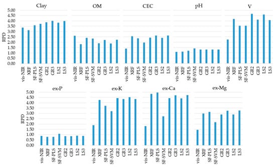 The prediction results of individual and combined vis-NIR and XRF models are presented in Figure 5 (with their details shown in Table A2, in the Appendix Section). The prediction performance of the vis-NIR sensor was satisfactory (RPD ≥ 1.40) for clay, OM, CEC, V, ex-K, ex-Ca, and ex-Mg. The best prediction performance was obtained for clay, with excellent performance (RPD = 3.37). Predictions of OM and V were of good performance, with RPD values of 2.61 and 2.26, respectively. Reasonable predictions (1.40 ≤ RPD < 1.89) were achieved for CEC, ex-K, ex-Ca, and ex-Mg, while pH and ex-P had poor prediction performances (RPD ≤ 1.10).