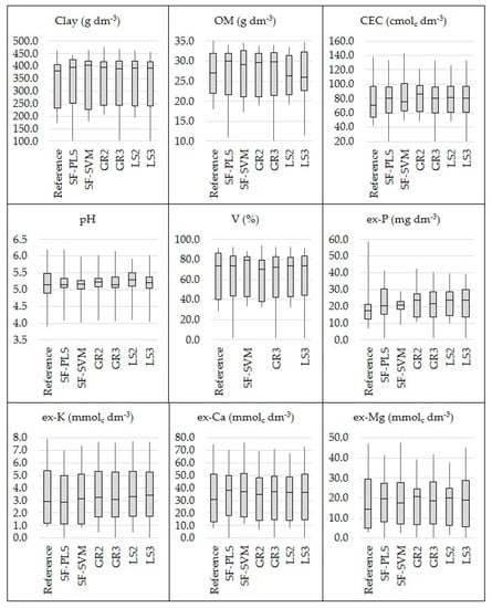 Comparing the six different data fusion approaches, there was no one method that stood out unanimously for all evaluated attributes (Table 1). In addition, all of them were effective in covering a similar range when comparing the dataset of predicted soil attributes with their respective reference values (Figure 6). Four out of the nine studied soil fertility attributes (clay, pH, ex-Ca, and ex-Mg) showed an increase in predictive performance with the SF-PLS approach (with RI ranging from 3 to 7%), three out of the nine (clay, pH, and ex-P) with SF-SVM (with RI ranging from 10 to 21%), four out of the nine (clay, pH, V, and ex-K) with the GR2 (with RI ranging from 4 to 16%), five out of nine (clay, CEC, pH, ex-K, ex-Mg) with the GR3 approach (with RI ranging from 2 to 16%), five out of nine attributes (clay, pH, V, ex-P, and ex-K) with the LS2 (with RI oscillating from 3 to 16%), and six out of nine attributes (clay, CEC, pH, ex-P, ex-K, and ex-Ca) with the LS3 approach (with RI oscillating from 1 to 16%). At the same time, a reduction in the predictive performance was obtained for the SF (with RI ranging from −18.40 to −8.45%) for five out of nine studied fertility attributes (OM, CEC, V, ex-P, and ex-K), for the GR2 (with RI ranging from −37.47 to −3.11%) for also five out of nine attributes (OM, CEC, ex-P, ex-Ca, and ex-Mg), for the GR3 approach (with RI ranging from −17.97 to −1.79%) for four out of nine attributes (OM, V, ex-P, and ex-Ca), for the LS2 approach (with RI ranging from −38.90 to −3.39%) for also four out of nine attributes (OM, CEC, ex-P, ex-Ca, and ex-Mg), and for the LS3 approach (with RI ranging from −17.49 to −2.15%) for three out of nine attributes (OM, V, and ex-Ca).