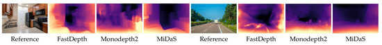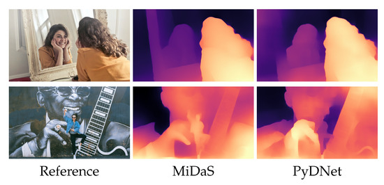 Figure 4 shows some qualitative examples of depth maps processed from Internet pictures by MegaDepth [54], the model by Li et al. [35], MiDaS [17] and the networks trained through knowledge distillation.