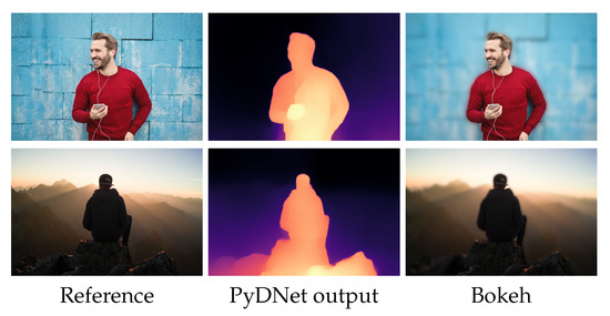 Bokeh effect. The first application consists of a bokeh filter, aimed at blurring an image according to the distance from the camera. More precisely, in our implementation, given a threshold , all the pixels with a relative inverse depth smaller than are blurred by a 25 × 25 Gaussian kernel. In Figure 6, we show the bokeh effect appliedto single images sampled from the web, for which neither stereo pairs nor video sequences are available.