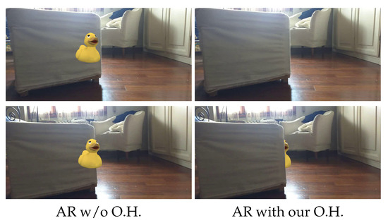 Differently from other approaches, such as [55,56], our networks do not require SLAM points to infer dense depth maps, nor a fine-tuning of the network on the input video data. In our case, a single image and at least two points in scale suffice to obtain absolute dense depth perception. Consequently, we do not rely on other techniques (e.g., optical flow or edge localization) in our whole pipeline for AR. Nevertheless, it can be noticed in Figure 8 how our strategy coupled with PyDNet can produce competitive and detailed depth maps leveraging a single RGB image only. Figure 9 shows some qualitative examples of an AR application, i.e., visualization of a virtual duck in the observed scene. Once positioned on a surface, we can notice how foreground elements do not correctly hide it without proper occlusion handling. In contrast, our strategy allows for a more realistic experience, thanks to the dense and robust depth map inferred by PyDNet and sparse anchors provided by a conventional AR framework. A video concerning two different sequences is available at this link: https://www.youtube.com/watch?v=DQPmNpMcF9Q.
