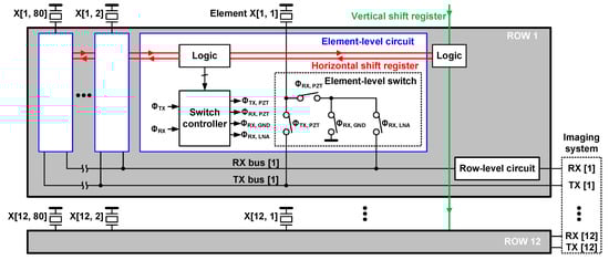 Figure 3 shows the top-level architecture of the second-generation ASIC. The 80 elements in each row of the matrix shared a row-level RX and TX bus to reduce channel count by a factor of 80. Even with 1 × 10 tiled ASICs, the total number of RX and TX channels was 240, which could be managed by an imaging system. Each transducer element was connected to the RX bus or the TX bus through a programmable element-level circuit. The RX bus was associated with a shared row-level circuit, which amplified the received echo signals, filtered out-of-band noise, and drove the connection to the imaging system.