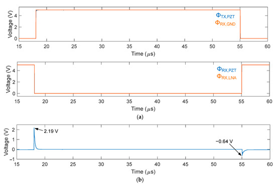 To minimize the switching transients discussed in the previous section, we proposed a new timing diagram, shown in Figure 6a, of the switch control signals. At the transition from RX to TX, the RX bus was first disconnected from the element by making ΦRX, LNA low while ΦRX, PZT remained high. Subsequently, M5 was turned on by making ΦRX, GND high; thus, a low-impedance discharging path from the element to ground was created before actuating M1 and M2 associated with the HV TX switch. Thus, when ΦTX, PZT was made high, the clock feedthrough-induced current could flow to the ground through transistor M5 instead of to the element. Finally, when ΦRX, PZT was made low, the charge injection error from M4 could be absorbed to both ground and the low-impedance output of the pulser. This switching sequence reduced the peak amplitude of the switching transients significantly at the transition of RX to TX. Although M6, a 5 V device, was switching without a discharging path to the ground, the associated transient was not critical because M6 was much smaller than the high-voltage devices.