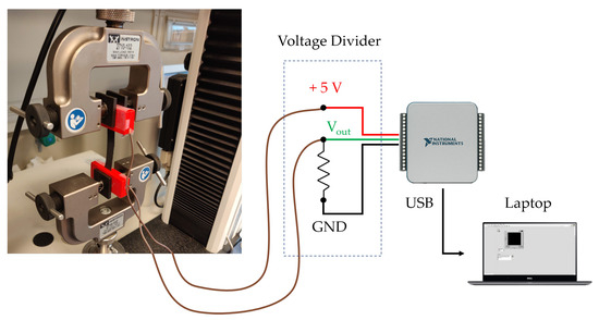 The sensing elements used for RR monitoring have been characterized under both static conditions and during hysteresis cycles. This deep investigation was needed since we developed elements with custom shapes and sizes. The sensing element is a conductive fabric (EeonTeXTM LG-SLPA by Eeonyx, Pinole, CA, United States) about 0.6 mm thick cut in a 50 mm × 10 mm (length × width) rectangular shape. When this fabric undergoes strain (), its electrical resistance (R) changes. The amount of resistance change (R) is related to the applied strain. To assess the metrological properties of the sensing element and to evaluate its use for respiratory monitoring, static and hysteresis tests were performed using a traction/compression testing machine (Instron 3365 by Illinois Tool Works Inc, Norwood, MA, United States). The sensor was positioned between the machine clamps and connected via two copper wires to a voltage divider allowing transducing the R due to strain into voltage variations. An acquisition board (NIDAQ 6002 by National Instruments, Austin, TX, United States) was used both to power the voltage divider at +5 V and to record its output, see Figure 1.