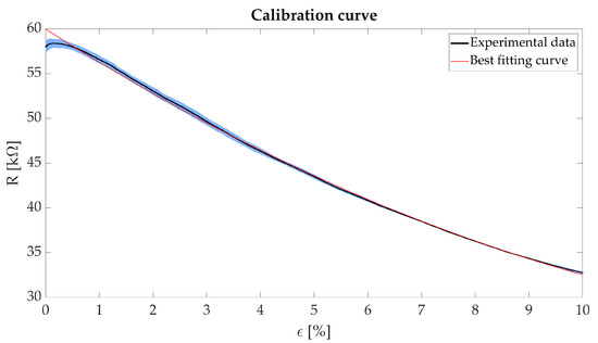 To calculate the calibration curve, we recorded both the sensing element output (R) and input (). The acquired data were elaborated in a MATLAB® environment using a custom algorithm. The average R and its related uncertainty was calculated from the four performed trials. The calibration curve has been calculated as the best fitting quadratic polynomial of the experimental data. Figure 2 shows the obtained results reported as mean ± expanded uncertainty. The uncertainty has been calculated according to [25].