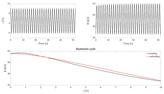 We performed four static tests by setting two parameters: (i) the speed to strain the sensing element (a low speed of 1.5 mm·min was set, to mimic quasi-static condition) and (ii) the maximum strain applied to the sensing element (i.e., = 10% was set). This value comprises respiratory-induced deformations of the rib cage which the sensing element will undergo for this specific application [24]. The R of the sensing element due to the applied have been calculated by the voltage divider equation. Figure 2 shows R plotted versus .