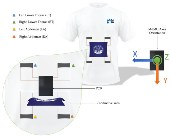 The wearable system is a T-shirt embedding four sensing elements to detect the respiratory activity and a custom developed printed circuit board (PCB) for signal conditioning and data storage.