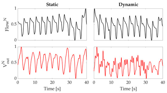 Normalized output data from the wearable system () and reference flowmeter () used. The left plots show the signals obtained in the static task; the right ones show the signals obtained in the dynamic task.