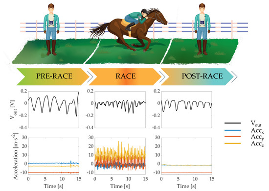The jockeys wore the system underneath the mandatory protective vest as shown in Figure 5. The protective vest is slightly compressive, but the pressure exerted on the jockey’s chest is irisory. In addition, the vest helps to stabilize the board on the chest, effectively eliminating excessive vibrations of the case, which could drive the measuring system.