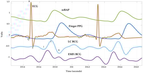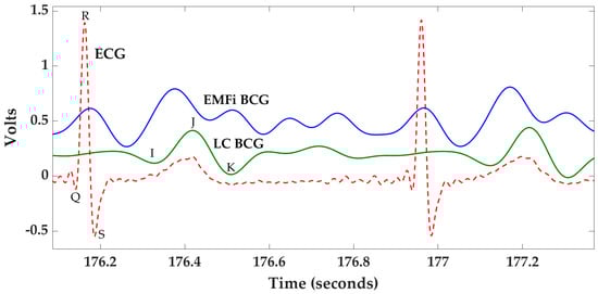 A BCG is a representation of the body’s recoil response to the forces created by the heart as it pumps blood into the vascular system [9]. An acquired BCG is thus a representation of a more general three-dimensional signal that contains vector components with axial directions named with respect to the body—front-to-back, head-to-foot, and side-to-side [10]. Different methods to gather BCGs exist, including wearable systems, weighing scales, chair-based systems, and bed-based systems. Although somewhat intrusive, wearable systems, which provide continuous measurements, have been investigated for this purpose [11,12]. Weighing scales, which measure the head-to-foot axial component, are possibly the most researched methodology [6,13,14,15]. However, these systems do not have an important property of other BCG systems—the ability to monitor cardiovascular data unobtrusively without effort from the user. Truly non-unobtrusive systems include chair-, bed-, video-, or radar-based systems [7,16,17,18,19,20,21,22,23]. Of these, our team has experience with bed-based systems, and two sample BCGs acquired with a bed system that employs two different sensing technologies (electromechanical films (EMFis) and load cells) are illustrated in Figure 1 along with a time-aligned ECG. The main BCG features (I, J, and K) are annotated for the load cell BCG (LC BCG).