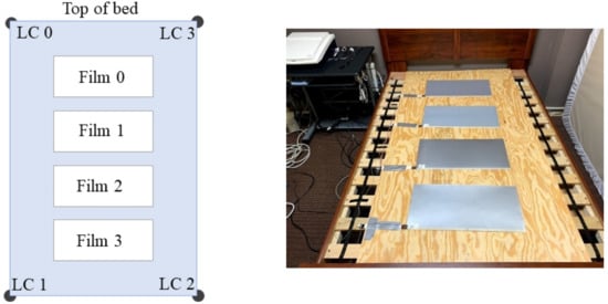 Approximate EMFi and load cell locations (not drawn to scale) (left) and the actual film locations (right), where the mattress has been removed and is leaning on the wall next to the bed.
