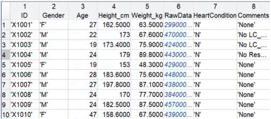 The metrics in Table 4 were derived from the preprocessed dataset. Average heart rate varied considerably between participants, ranging from 42 to 92 beats per minute. The systolic pressure range (max−min) varied from 11 to 46 mmHg, and the diastolic pressure range varied from 5 to 27 mmHg.