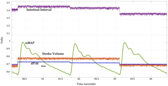 Representative signals collected from the Finapres Finometer PRO®. As in Figure 7, the reBAP signal is scaled at 100 mmHg/volt. The interbeat interval, stroke volume, and dP/dtmax are scaled at 1000 ms/volt, 100 mL/volt, and 1 mmHg/s/volt, respectively.