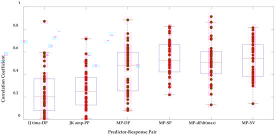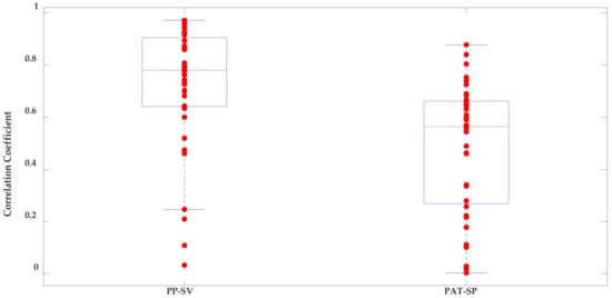 Table 5 presents the correlation coefficients for two predictor–response combinations. Pulse pressure, which is known to be well-correlated to SV [34], did offer a high average correlation coefficient of 0.72 +/− 0.24. The average correlation coefficient for PAT-estimated systolic blood pressure was 0.48 +/− 0.25. Boxplots illustrating the correlation coefficients for all 40 participants can be seen in Figure 9.