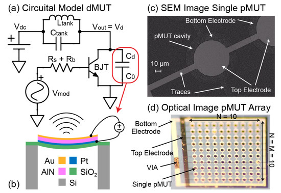 (a) Circuital model of the dMUT system. (b) Design of a single pMUT. (c) Scanning Electron Microscope (SEM) image of a single pMUT [19]. (d) Optical image of a fabricated pMUT array [19].