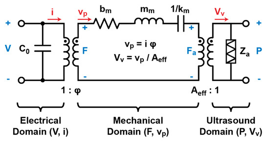 Mason circuital model of the pMUT [30,31,32]. Electrical, mechanical, and ultrasound domains are fully modeled. On one hand, the electrical domain is transformed into the mechanical domain through an ideal transformer of ratio 1:ϕ which is the electro-mechanical coupling factor. On the other hand, the mechanical domain is transformed into the ultrasound domain trough the effective area Aeff:1 which is 1/3 of the area of the pMUT membrane.