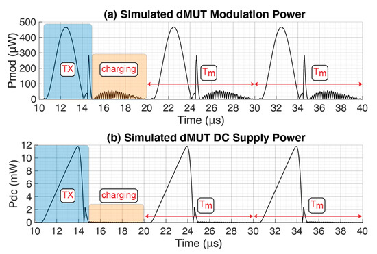 In this section we are going to compute the energy consumption of the dMUT system and compare it with the equivalent case of driving and modulating the pMUT array with the standard continuous wave (CW) approach. As shown in Figure 1a, the dMUT has only two voltage sources, Vmod and Vdc, which will set the power consumption for the circuit. In Figure 4 we are showing the dMUT power consumption when driving a 20 × 20 array. Since the waves are distorted, we are going to integrate the power over a modulation period Tm in order to determine the energy consumption, as following: