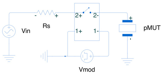 In order to have the same performance as the dMUT, the CW circuit needs to produce the same peak-to-peak voltage on the driven pMUT. In this case Vpp = 14 V as shown in Figure 3, thus we are going to assign this value to Vin = 14 V (or 7 V AC source) in Figure 5 operating at the resonance frequency of the pMUT array, fin = fpMUT. On the other hand, the voltage driven switch is ideal in the simulation, thus Vmod has no power consumption. However, the Vmod frequency of fmod = 100 kHz will set the period T = 10 μs, interval for which Vin is on, thus setting its energy consumption.