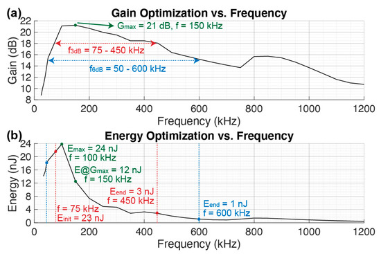 Figure 9 shows the gain and energy consumption while sweeping the frequency ratio FR. The gain reaches a maximum of Gmax = 23 dB at FR = 3 and then decreases linearly until FR = 30, after which there is a gain saturation Gsat < 1 as shown in Figure 9a. Instead, the energy consumption increases with a square root law while increasing the FR linearly. The minimum energy consumption is obtained at the beginning of the R3dB and R6dB resulting in E3dB = 5 nJ and E6dB = 2 nJ respectively at FR = 1.5 and FR = 1. In this last parameter sweep, the energy increases while increasing FR. This physically means that the LC tank filter is operating at higher frequency with respect to the resonance frequency of the pMUT array fpMUT, thus it requires more energy for the filter to operate and charge up. Finally, the energy reaches a saturation level Esat = 53 nJ when FR > 30, similar to the N sweep in Figure 7. This happens because the gain also reaches a saturation Gsat < 1, making the dMUT system very inefficient, thus the resulting energy consumption is the one that is required to drive the Cd without the dMUT circuit.