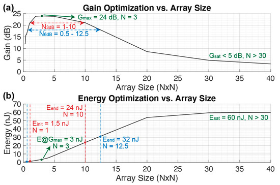 Gain (a) and energy (b) optimization over a sweep on the array size NxN. The remaining values are maintained constant as in Table 1.