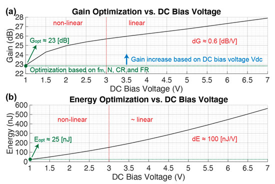 High performance gain (a) and energy (b) consumption based on the DC biasing voltage Vdc of the LC tank filter. The remaining values are maintained constant as in Table 1.