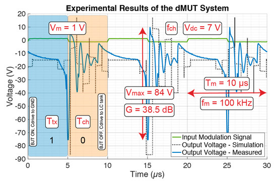 In Figure 12 the experimental results of the dMUT system are shown based on the values from Table 1 with the exception of the DC biasing voltage that is increased to Vdc = 7 V for high performance applications. The “green” curve shows the input modulation signal Vm = 1 V at fm = 100 kHz. Further, the “black-dotted” curve shows the simulation of the output voltage generated on top of the driven capacitance of the dMUT array. This curve is a good match with the experimentally measured output voltage indicated by the “blue” curve. The output voltage shows a maximum of Vmax = 84 V when a DC bias of Vdc = 7 V is applied to the LC filter corresponding to a system gain of G = 38.5 dB.