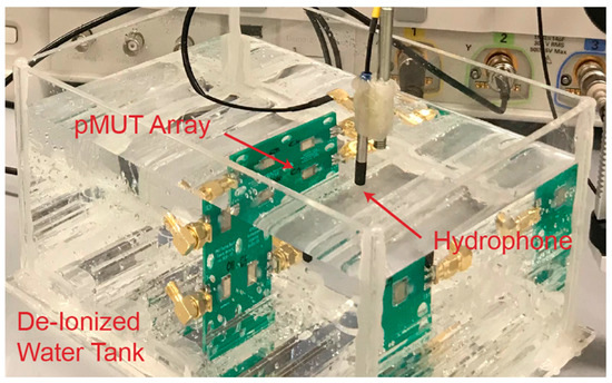 In order to demonstrate the advantage of driving a pMUT array with the dMUT system as opposed to traditional CW, we are going to perform an ultrasonic transmission experiment in a De-Ionized (DI) water tank as shown in Figure 13. The pMUT array is used as a transmitter and is driven either by the dMUT system or by a simple CW system. The received signal is then received and captured by an underwater ultrasonic hydrophone (Teledyne TC4038) and converted into electrical signal. The sensitivity of such device is −228 dB reference to 1 V/μPa, which sets the minimum detectable signal. Translated into electrical signal, this means that the Noise Floor (NF) is NF = 4 μV peak-to-peak, thus the incoming ultrasonic signal needs to generate a signal higher than the NF in order to be detectable.