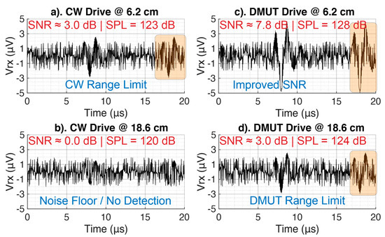 Secondly, we drive the pMUT array with the dMUT system at the same energy level as the CW drive. At the same maximum distance as the CW, the dMUT system shows higher SPL ≈ 128 dB and in particular the SNR ≈ 7.8 dB as shown in Figure 14c. This corresponds to an improvement of 2.8 in dB scale or 3× in linear scale.