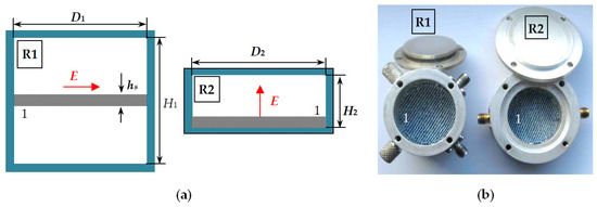 Two-resonator method: (a) Pair of resonators for measurement of parallel (R1) and perpendicular (R2) dielectric parameters of disk samples in cylindrical TE (R1) and TM-mode (R2) resonators; (b) Photography of resonators R1 and R2 with denim textile sample 1; E—electric field.
