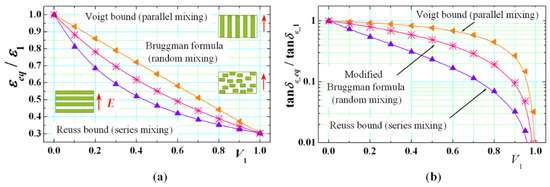 The Equation (1) is a complex one; it can be rewritten also for a direct calculation of the corresponding dielectric loss tangents bounds (modified Bruggman formula); see the dependencies in Figure 2b: