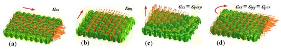 Independent extraction of the resultant dielectric constant along all three axes is possible after the replacing of the anisotropic sample under test with an equivalent isotropic sample (as in Figure 3c). The procedure is as follows. After the selection of each unit cell and the construction of the whole artificial 3D sample (see below), placed in the middle of the selected resonator, the resonance frequency fr and Q factor of the corresponding mode can be obtained by simulations in “eigenmode option”. Then, the anisotropic structure is replaced with an equivalent prism of the same dimensions and by tuning the corresponding isotropic values εeq and tan δεeq, a coincidence should be reached (typically <1%) between both simulated pairs fr and Q for the anisotropic sample and its isotropic equivalent. Thus, the corresponding dielectric parameters of the biaxial anisotropic textile samples can be obtained by using the excited modes in Figure 4a–c, while the parameters for the uniaxial anisotropic textile samples (most of the cases) can be obtained by using the modes in Figure 4c,d.