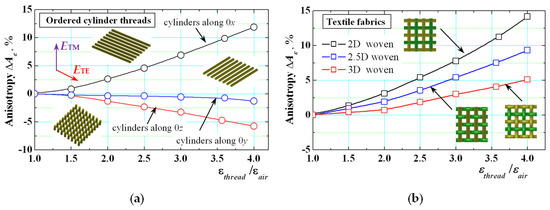 Dielectric constant anisotropy of artificial textile samples versus the ratio between the dielectric constant of the threads and air εthread/εair: (a) for ordered straight cylinders, orientated along axes 0x, 0y or 0z; (b) for 2D, 2½D and 3D woven fabrics in Ku-band (see Figure 6) (Arrows: E fields of the used TE and TM modes).