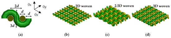 (a) Woven threads of corresponding dimensions; three types of woven fabrics: (b) 2D woven; straight threads along 0x, 0y; (c) 2.5D woven; straight threads along 0y, wavy threads along 0x; (d) 3D woven; wavy threads along 0x, 0y (all threads are with equal dielectric constant εthread = 3.4).