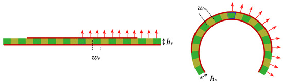 Most of the modern electromagnetic simulators have options for the introduction of anisotropic materials. However, in the case of conformal planar structures, this is not easy to perform directly, when the substrate has been introduced as a single object and to be sure that the anisotropy is accurately described. Therefore, we chose a geometrical approach. The anisotropic substrate is divided into several equal slices with a form of prisms (with rectangular cross-section view for the flat resonators and with trapezoidal cross-section view for the flat resonators). The slices have equal anisotropic properties as the whole substrate, but the parallel and perpendicular directions used to determine the uniaxial anisotropic dielectric parameters can be controlled now for each slice with the change of the bending radius—as it is sown in Figure 9 for the half of structures. In this research, the concrete width ws of the slices is chosen to be ws = 2 mm but can be decreased for thicker substrates or smaller bending radii for better fitting of the cross-section of the bent substrate. The other sizes are height hs and length ls = Ws. The 3D views of flat and bent microstrip resonators on sliced anisotropic substrates are presented in Figure 10. During the bending, we satisfy the rule to keep the resonator dimensions L and W. However, the ground and the slices may undergo some deformations.