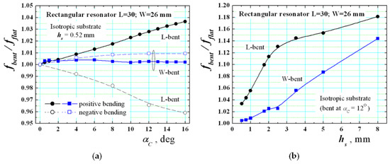 Figure 15b presents the ratio fbent_aniso/fflat_aniso between the resonance frequencies of mode TM10 for L-/W-bent rectangular resonators on anisotropic substrates versus the curvature angle αC. Now, this ratio is measurable and can be verified experimentally. The new dependencies show that the resonance frequency shift in resonator on realistic (anisotropic) substrates may have as positive, as well as negative signs depending on the actual parameter ΔAε, which is impossible for pure isotropic substrates. We also investigate the influence of the substrate thickness hs on corresponding ratio fbent_aniso/fflat_aniso. Figure 14b presents curves for L- and W-bent resonators at curvature angle αC = 12°. The results show that the bending effect can compensate the anisotropy influence for thicker substrates to some degree. It is interesting to note that as in [30], we observe the fact that for mediate thicknesses (named “optimal thickness” in [30]) the effect of anisotropy decreases the bending effect; this property probably depends on the curvature angle αC and not investigated in detail.