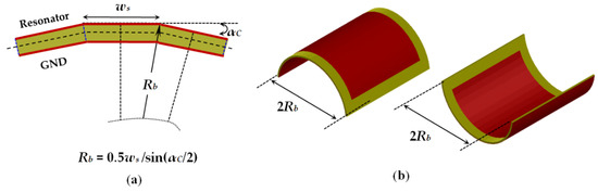 (a) Definition of the relation between the curvature angle αC and bending radius Rb; dashed line: middle line in the resonator substrate, where the effective electrical length of the resonator is formed; (b) resonance structures on positive (+αC) and negative (−αC) bent substrate (the bending radius Rb is always determined to the side of the resonator layout).