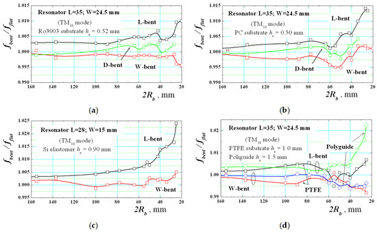 The next step is to prove experimentally these tendencies. Figure 13 gives a set of measurement results for the ratio fbent/fflat of the lowest-order TM10 mode in bent and flat rectangular resonators on several isotropic substrates versus the bending radius Rb. Three types of dependencies are shown—for L-, W and D-bent resonators. All the results are close to results from the numerical simulations in Figure 11a (D-bent resonators are not simulated). They depend on substrate flexibility and deformations. The best results are got for the well-flexible silicone elastomer (hs = 0.9 mm), Figure 13c. Good results are obtained by Ro3003 substrate (hs = 0.52 mm), Figure 13a; however, at small bending radii, this soft substrate undergoes technological stretching and fbent slightly decreases. The harder substrate PC (hs = 0.5 mm) shows better stability at low Rb. The results for the soft PTFE substrate (hs = 1.0 mm) deviate from the theoretical dependencies due to the poor adhesion properties of this materials to the metal folio. However, the PTFE-like material with the commercial mark Polyguide®Polyflon (hs = 1.5 mm) demonstrates better behaviour. In all presented cases, the curves for D-bent substrates (moderate influence) lie between the curves for L-bent (upper curves; stronger influence) and W-bent substrates (lower curves; smaller influence). Thus, we can conclude that the experimental results for the pure bending effect on planar resonators on isotropic substrate fully confirm the numerical simulations, taking into account the possible substrate deformation during the bending on very small radii Rb.